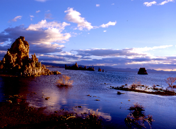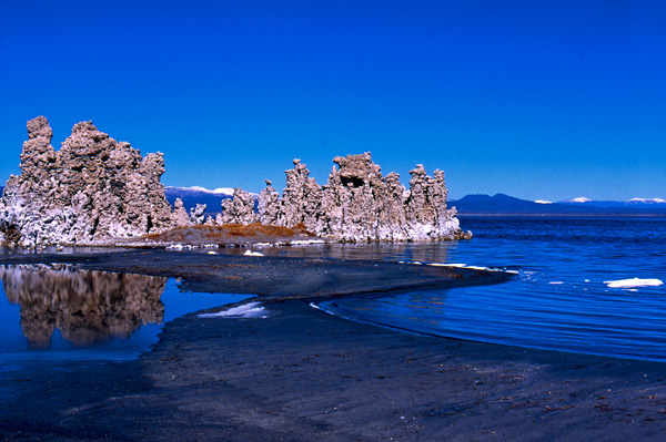 Mono Lake lies directly east of California's Yosemite National Park. A typical Great Basin lake, Mono is saltier than the ocean and exceeded in saltiness only by the Great Salt Lake in Utah. It is surrounded by remnants of volcanic activity, including a couple volcanic islands in its midst. One of its most extraordinary features is its tufa formations. These are columns of calcium carbonate that were deposited under water, when the lake level was substantially higher, by the action of fresh-water springs mixing with the lake's salty water. Canoists will still see springs bubbling up from the lake's floor.