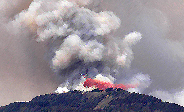Adobe's PhotoShop is a tremendously rich artistic tool that includes features you can use to create images wildly beyond your imagination. As an example, compare this color photograph of an aerial drop at a recent hillside fire with this painterly image of the same scene made with one of PhotoShop's "Filter" tools. In the latter, the photograph itself has merely provided the basic material from which a radically different kind of image has been created. In between the two examples is a very wide range of images that can only leave us wondering exactly what a photograph is. If I use PhotoShop to remove an offending power line, for instance, is my image still a "photograph"? The issue surfaces in a multitude of ways. A "nature photographer" was accused of abusing his medium, recently, because he produced a cute image with a whole row of ground squirrels looking over a log. Unfortunately, the original image only included one ground squirrel! He had "PhotoShopped" the others in from different photos.